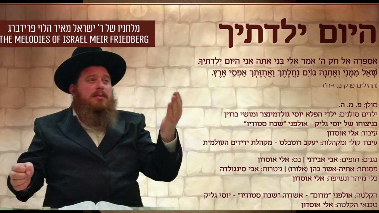 אנו שמחים להציג בפניכם את הלחן החדש והמרגש "היום ילידתיך" מאת המלחין ר' ישראל מאיר פרידברג. לחן מיוחד זה נולד בין הרי צפת למירון, במקום הקדוש שבו שוכן רבי שמעון בר יוחאי זי"ע, והולחן לכבוד יום הולדתו החמישים של אחד מהרבנים הנודעים שליט"א.