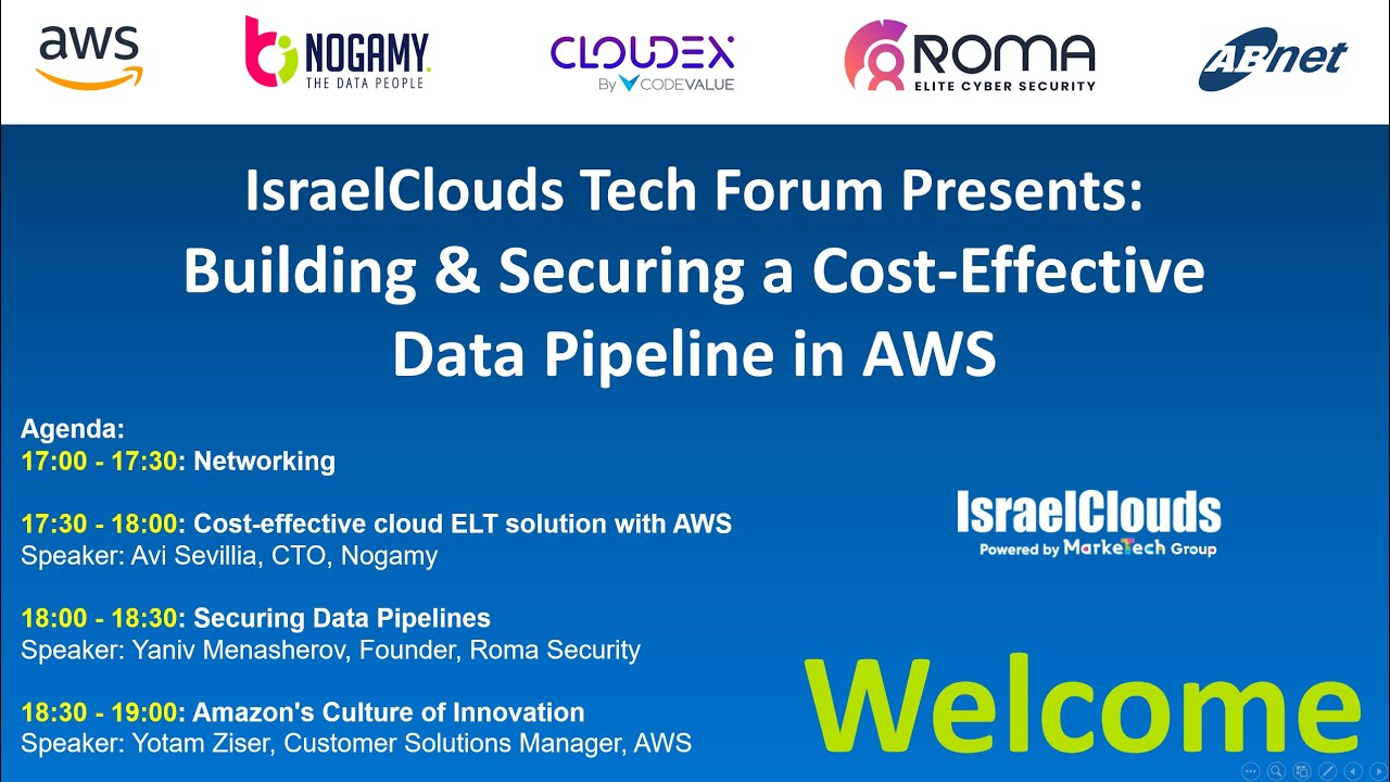 הצטרפו אלי למועדון: https://tinyurl.com/AviJoin הירשמו לערוץ שלי: http://tinyurl.com/SubsAviCyber היכנסו לערוץ שלי: https://tinyurl.com/AviCyberChannel Date & Location: December 17, 2024 | 17:00 | AWS Offices Tel Aviv 28th Floor Registration Form: https://israelclouds.activetrail.biz/Building-Securing-Cost-Effective-Data-Pipeline-AWS Agenda: 17:00 - 17:30: Networking 17:30 - 18:00: Cost-effective cloud ELT solutions with AWS Speaker: Avi Sevillia, CTO, Nogamy Overview: Learn how to transfer data to AWS at an incredibly low cost. We'll demonstrate how to use AWS Glue in a minimal runtime environment to upload hundreds of gigabytes to the cloud for less than a dollar! For comparison, similar operations with other ELT tools can cost thousands of dollars. 18:00 - 18:30: Securing Data Pipelines Speaker: Yaniv Menasherov, Founder, Roma Security Overview: Securing data pipelines is crucial for protecting sensitive information as it moves from on-premises systems and third-party SaaS applications into cloud data services. The use of ELT processes, along with varying licensing requirements and non-human identities (NHI), adds significant complexity to this task. As organizations automate more data workflows, they face increased risks of security. This presentation will cover the threats, and key protection strategies to secure these pipelines, ensuring data and identities remain protected throughout their lifecycle. 18:30 - 19:00: Amazon's Culture of Innovation Speaker: Yotam Ziser, Customer Solutions Manager, AWS Overview: Amazon has a peculiar approach to innovation that is intrinsically linked to how we use technology and organize our teams. In this session, customers are introduced to how we innovate at Amazon, organized around four interdependent elements: culture, mechanisms, architecture, and organization. Customers can dive deeper on each topic, including leadership principles, working backward, and two-pizza teams