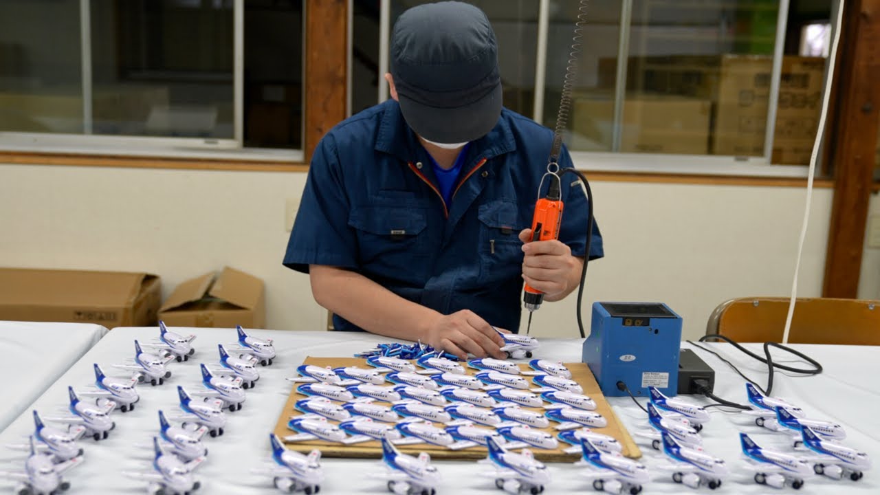 飛行機のおもちゃを大量生産するプロセス。60年伝統の日本のおもちゃ工場。