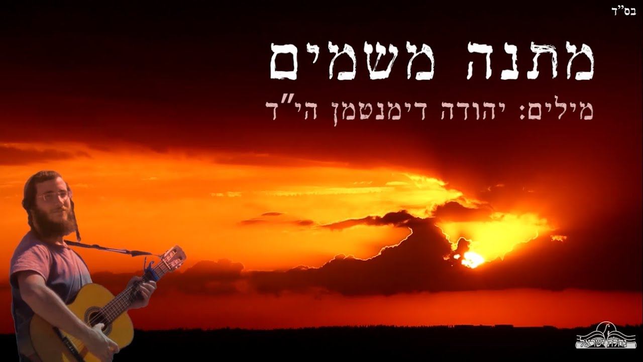 בס"ד תודה רבה לה' יתברך על הפרוייקט המדהים הזה! "מתנה משמים" שיר שכתב יהודה דימנטמן הי"ד בשנות לימודיו בישיבתינו. "יהודה כאב מאוד את היחס של הרבה אנשים לתורה. למשל: אם לחייל יש מסע כומתה אז ברור שכל המשפחה תגיע, אבל אם תלמיד מסיים מסכת המשפחה תבוא?! היא בכלל תדע על זה? יהודה השתדל בכל סיום מסכת להביא כיבוד, להביא את ההורים לחומש, לעשות סעודה וכו'. למה בגלל שמישהו אומר שעשה כך וכך בצבא אז כולם מעריכים אותו אבל אברך זה בכלל לא מעניין ולא נחשב ולפעמים אפילו מעקמים את האף על זה שהוא לא עשה צבא?. אם היה אירוע משפחתי יוצא על סדר בישיבה אז לא היה תמיד כל כך ברור ליהודה שהוא מגיע. הוא אמר: מה זאת אומרת? אני לומד! (וזה לא שהמשפחה לא הייתה חשובה לו, להפך)." (אתיה) שנזכה להידבק במסירות נפשו ואהבתו לתורה הקדושה! מילים: שְׁלַב אַחֲרֵי שְׁלַב, דַּף אַחֲרֵי דַּף, לַמְרוֹת שֶׁאֲנִי בִּכְלָל לֹא עָף. יוֹם אַחַר יוֹם, שָׁבוּעַ אַחַר שָׁבוּעַ, מִסְתַּבֵּךְ בְּעַצְמִי מַמָּשׁ תָּקוּעַ. צִפִּיתִי, יִחַלְתִּי, הִתְפַּלַּלְתִּי, וְבִּקַּשְׁתִּי, אַכְזָבָה הַדָּבָר הַיָּחִיד שֶׁקִּבַּלְתִּי. לֹא רוֹאֶה אוֹרוֹת, מִתְמוֹדֵד מוּל בְּעָיוֹת, רוֹאֶה רַק יְרִידוֹת כִּשְׁלוֹנוֹת וּנְפִילוֹת. מִתְעַקֵּשׁ פַּעַם אַחַר פַּעַם, מְנַסָּה לְהַרְגִּישׁ טִפָּה תִּ'טׇעַם. צִפִּיתִי, יִחַלְתִּי, הִתְפַּלַּלְתִּי וְבִּקַּשְׁתִּי, אַכְזָבָה הַדָּבָר הַיָּחִיד שֶׁקִּבַּלְתִּי. אֲבָל פִּתְאוֹם שֶׁהִסְתַּכַּלְתִּי לְאָחוֹר, רָאִיתִי שֶׁכֻּלֵּי מְשֻׁפָּע בָּאוֹר, דַּף וְעוֹד דַּף נֶהְפַּךְ לְמַסֶּכֶת, וּפַעַם אַחַר פַּעַם יָצָאתִי מֵהַתִּסְבֹּכֶת, שָׁבוּעַ אַחַר שָׁבוּעַ הָפַךְ לִשְׁנָתַיִם, מַרְגִּישׁ שֶׁכָּל חַיֵּי מַתָּנָה מִשָּׁמַיִם! ______ קרדיטים: לחן: צור חיים בן משה ביצוע: תלמידי ישיבת נחלת ישראל עיבוד: עופרי הורן הפקה מוזיקלית: עופרי הורן קלידים ותכנותים: עופרי הורן קולות: צור חיים בן משה, אלישיב ישראל אסולין, בניה חזקיה בן ארי, עוז שפירא ועופרי הורן. גיטרות: עופרי הורן גיטרה בס: יואב שולויס חלילים: יהודה הכהן חליל צד: שלמה שמואליאן מיקס ומאסטרינג: עופרי הורן קליפ: משתתפים: תלמידי ישיבת נחלת ישראל תמונות ומכתבים: באדיבות המשפחה צילום : נתנאל ליברזון 0587544866 עריכה: נתנאל ליברזון, צור חיים בן משה ויצהר מרדכי שריד תודה רבה לה' יתברך על ה כ ל ! תודה ליוחאי נוסים על כל התמיכה.