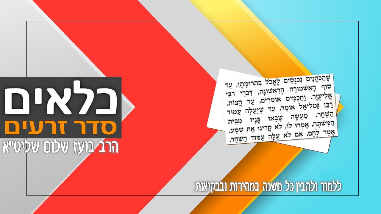 המשנה היא קובץ של פרשנויות על המקרא שתרם רבות לעיצוב היהדות וארגון החיים היהודיים לאחר חורבן הבית השני. המשנה חוברה במשך כמה דורות משלהי ימי הבית השני ובעיקר ב-150 השנים שעברו מאז חורבנו בשנת 70 לספירה. המשנה מחולקת לשישה 'סדרים', המכילים כל אחד מספר 'מסכתות'. כל מסכת עוסקת בנושא ספציפי אחד המרומז בשמה של אותה המסכת. סדרי המשנה נועדו להוות קו מנחה ובסיס איתן לשם קביעת ההלכות בקהל ישראל, לדורות. סדר זרעים – עוסק בברכות ובמצוות התלויות בארץ. מכיל 655 משניות ב-11 מסכתות. סדר מועד – עוסק בשבתות, חגים ותעניות. מכיל 681 משניות ב-12 מסכתות. סדר נשים – עוסק באישות, קידושין, גירושין וכדומה. מכיל 578 משניות ב-7 מסכתות. סדר נזיקין – עוסק בדיני ממונות וסדרי המשפט. מכיל 685 משניות ב-10 מסכתות. סדר קדשים – עוסק בבית המקדש ובקורבנות. מכיל 590 משניות ב-11 מסכתות. סדר טהרות – עוסק בסוגי טומאות וטהרתן. מכיל 1,003 משניות ב-12 מסכתות. שישה סדרי משנה סדר זרעים: ברכות, פאה, דמאי, כלאיים, שביעית, תרומות, מעשרות, מעשר שני, חלה, עורלה, ביכורים. סדר מועד: שבת, עירובין, פסחים, שקלים, יומא, סוכה, ביצה, ראש השנה, תענית, מגילה, מועד קטן, חגיגה. סדר נשים: יבמות, כתובות, נדרים, נזיר, סוטה, גיטין, קידושין. סדר נזיקין: בבא קמא, בבא מציעא, בבא בתרא, סנהדרין, מכות, שבועות, עדויות, עבודה זרה, אבות, הוריות. סדר קודשים: זבחים, מנחות, חולין, בכורות, ערכין, תמורה, כרתות, מעילה, תמיד, מידות, קינים. סדר טהרה: כלים, אוהלות, נגעים, פרה, טהרות, מקוות, נידה, מכשירין, זבים, טבול יום, ידיים, עוקצים. הרב בועז שלום שליט"א הוציא בשנים האחרונות אלפי שיעורי תורה במגוון נושאים. שיעורים מעמיקים בתנ"ך, משנה, דף היומי, מחשבה, מוסר, הלכה, אגדה, עין יעקב, אור החיים, חומש עם רש"י, כלי יקר, דרשות על פרשת שבוע, ועוד. הרב מכהן כיו"ר ארגון 'טעמו וראו', וראש מדרשת 'בית אליהו' ברחוב דב גרונר 11 בבני ברק. במשך שנים עסק הרב במסירת הרצאות ובקירוב רחוקים בארגון 'ערכים' ובערוץ 'הידברות' במגוון נושאים. כמו כן מוסר הרב שיעורים קבועים במדרשת 'פסגות' שברחוב בן ציון גליס 37 אזוה"ת סגולה בפ"ת. הרב בועז שלום חיבר שני ספרים 'משנת החלומות' ו'משנת הגלגולים'. לרב בועז שלום אתר אינטרנט בשם "טעמו וראו" שם תוכלו למצוא את כל שיעוריו בכתובת https://taamu.co.il השיעורים ניתנים לשמיעה ואף להורדה בחינם. באתר ניתן אף להעיר או לשאול על השיעורים ולקבל את תגובת הרב. זכות השיעור לעילוי נשמת אברהם בן ימנה ויעקב ויוסף בן אורה וחיים.