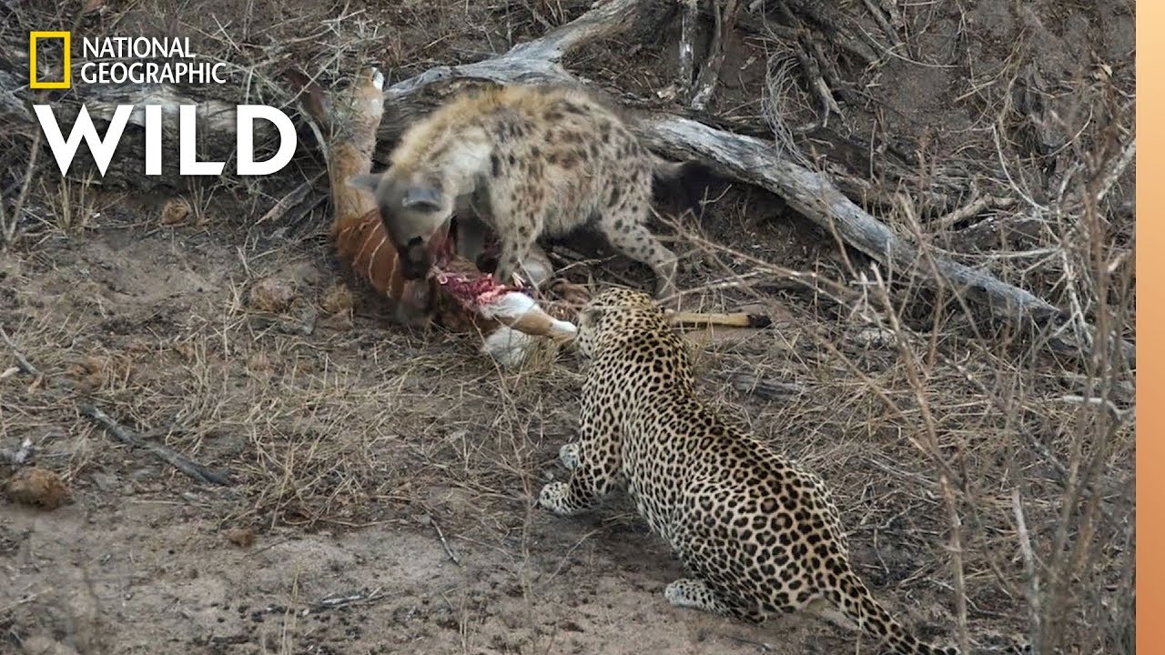 Thievery reigns supreme amongst the animals of the South African bush ➡ Subscribe: https://on.natgeo.com/41A7tf0 #NatGeoWILD #Hyenas #Leopards About National Geographic Animals: National Geographic Animals brings you closer to the wild than ever before. Take a journey through the animal kingdom to discover fierce predators, surprising behaviors, adorable babies, and more through our fascinating wildlife documentaries, series, and specials. Get More National Geographic: Official Site: https://nationalgeographic.com Instagram: https://instagram.com/natgeo Facebook: https://facebook.com/natgeo Threads: https://threads.com/@natgeo X: https://x.com/NatGeo LinkedIn: https://linkedin.com/company/national-geographic TikTok: https://tiktok.com/@natgeo Reddit: https://reddit.com/user/nationalgeographic Pinterest: https://pinterest.com/natgeo A male leopard, known as Hosana to safari guides, and a hyena are feeding on the body of a pregnant ungulate. They stole the kill from the leopard’s half-sister, named Thandi. Both tear at the carcass to eat as quickly as possible, in an opportunistic tug-of-war. The big leopard is called Tingana, who is the father of Hosana. A three-way leopard standoff ensues. The carcass, stolen for the second time, seems to be in the firm grasp of Tingana. Hosana and Thandi wait at the bottom of the tree in case the big leopard drops his prize. Tingana victoriously urinates on the ground below, marking his territory. Learn more about hyena: https://on.natgeo.com/2ydS1aj Learn more about leopard: https://on.natgeo.com/2Y51pwa Hyena and Leopard Share a Meal—Before a Surprise Upsets Truce | Nat Geo Wild https://youtu.be/gbgwC9fGL5w Nat Geo Wild https://www.youtube.com/user/NatGeoWild