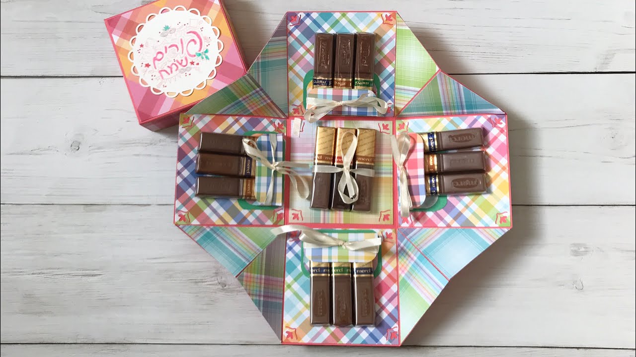 הדרכה לקופסא מתפוצצת מלאה בשוקולד! לקופסא: קארדסטוק בגודל ״12*״12 חורצים ב- ״4, ״8 בשני צדדים. למכסה: קארדסטוק בגודל ״3/8 7 * ״3/8 7 חורצים ב- ״5/8 1 על 4 הצדדים. ניירות מדוגמים; 8 חלקים בגודל- ״7/8 3 * ״7/8 3 1 - ״3/4 3 * ״3/4 3 קארדסטוק לחלק הפנימי של הקופסא: 1 - ״2 * ״2 4 - ״7/8 2 * ״3/4 1 כיס לשוקולד: 4 - ״3/4 2 * ״5/8 2 חורצים על ״3/4 2 ב- ״3/4 1, ״3/8 1