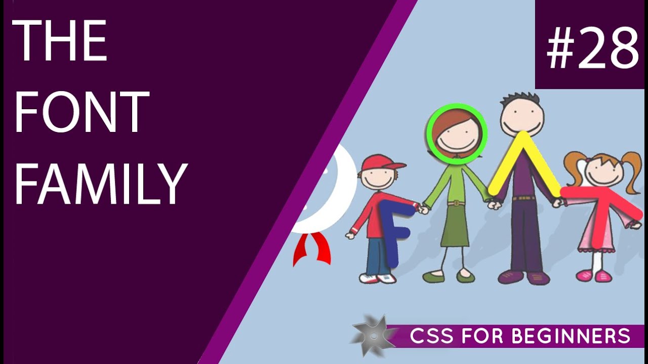 Yo ninjas, welcome to your 28th CSS tutorial for beginners. By now you should be getting comfortable with selecting elements on your page and applying styles to them. In this video we'll jump into the happy world of font families in CSS. You'll learn how to change the font style of your text & elements, and also how to create a font stack to allow additional fonts for the user to fall back on. Peace out, keep coding & have fun :). SUBSCRIBE TO CHANNEL - https://www.youtube.com/channel/UCW5YeuERMmlnqo4oq8vwUpg?sub_confirmation=1 ========== CSS for Beginners Playlist ========== https://www.youtube.com/playlist?list=PL4cUxeGkcC9gQeDH6xYhmO-db2mhoTSrT ========== HTML Basics Course ========== https://www.youtube.com/playlist?list=PL4cUxeGkcC9ibZ2TSBaGGNrgh4ZgYE6Cc ========== The Net Ninja ============ For more front-end development tutorials & to black-belt your coding skills, head over to - https://www.youtube.com/channel/UCW5YeuERMmlnqo4oq8vwUpg or http://thenetninja.co.uk ========== Social Links ========== Twitter - @TheNetNinja - https://twitter.com/thenetninjauk