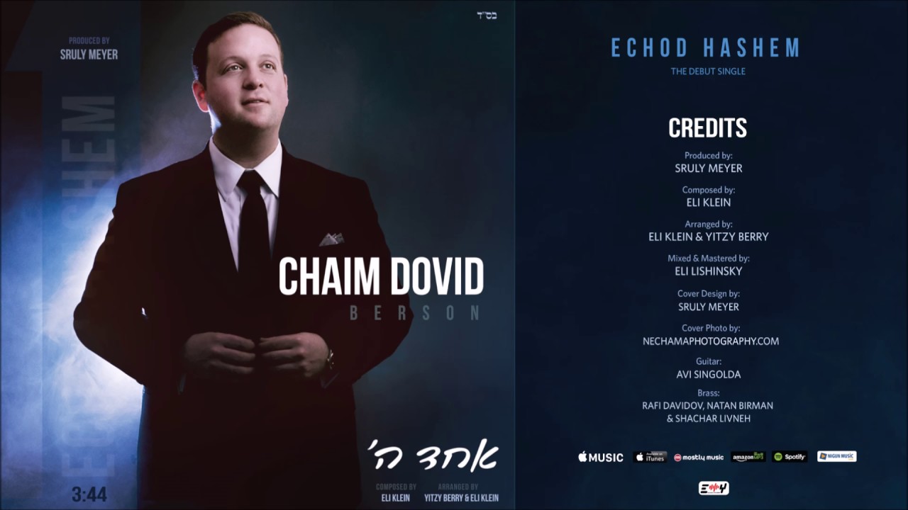 This might not be the first time many of you will be hearing of Chaim Dovid Berson, but for those that haven't yet, it's time to meet him! Chaim Dovid was born and raised in Yerushalayim, and is the chief cantor of the prestigious Manhattan Jewish Center. His melodious, lyrical tenor voice, his deep knowledge in music and T'filah as well his personal charisma, make Chaim Dovid Berson unique in his craft and much sought after as a chazzan and popular singer. Chaim Dovid has performed at music festivals throughout Europe, Israel and North America and led missions to Poland, teaching and inspiring visitors of all ages to connect to their Jewish roots and learn about the life and destruction of European Jewry. Chaim David is currently working on completing his debut album, featuring original songs with producer Sruly Meyer. Sruly has worked with several of today's top artists including Benny Friedman, and the two are hard at work to complete the album in time for a Summer release. In the meantime Chaim Dovid and Sruly wanted to release a taste of what to expect on the album, with this upbeat dance track, Echod Hashem, composed by Eli Klein and arranged by the super duo of Eli Klein and Yitzy Berry. The song is available to download on MostlyMusic and Nigun Music and is available on itunes and all streaming platforms! We hope you will enjoy it, and share it with your friends. Produced by: Sruly Meyer Composed by: Eli Klein Arranged by: Eli Klein and Yitzy Berry Mixed and Mastered by: Eli Lishinsky Guitar: Avi Singolda Brass: Rafi Davidov, Natan Birman & Shachar Livneh Cover Photo: Nechamaphotography.com Cover Design: Sruly Meyer Download at: MostlyMusic: https://mostlymusic.com/collections/frontpage/products/chaim-dovid-berson-echod-hashem-debut-single NigunMusic: https://www.nigunmusic.com/echod-hashem-free.html iTunes: https://itun.es/us/G36Iib Connect with Chaim Dovid Berson on Social Media: Twitter: https://twitter.com/cantorcd Facebook: https://www.facebook.com/chaimdavid.berson Instagram: https://www.instagram.com/chaim_dovid_berson זו אולי לא תהיה זו הפעם הראשונה שרבים מכם שומעים על חיים דוד ברסון, אבל עבור אלה שעדיין לא שמעו, זה הזמן לפגוש אותו! חיים דוד נולד וגדל בירושלים, כיום גר בארה״ב ומכהן כחזן הראשי של בית הכנסת היוקרתי הג׳ואיש סנטר, שבמנהטן, ניו יורק. חיים דוד ברסון הינו זמר וחזן מבוקש ושמו זכה לתהילה בישראל ובעולם הודות לקול הטנור הלירי והמלודי שלו, אישיותו הכרזימטית, וידיעותיו המעמיקות באמנות המוסיקה והתפילה. חיים דוד הופיע בפסטיבלים למוסיקה וקונצרטים באירופה, ישראל וצפון אמריקה ואף ליווה משלחות רבות לפולין העוסקות בחיזוק הזהות היהודית, והוראת השואה. חיים דוד עובד בימים אלו על השלמת אלבום הבכורה שלו, ובו שירים מקוריים עם המפיק שרולי מאיער. שרולי עבד עם כמה מהאמנים המובילים כיום כולל בני פרידמן, והשניים עובדים במרץ להשלים את האלבום בכדי שיוכל לראות אור בקיץ הקרוב. בינתיים חיים דוד ושרולי רצו לתת לכם טעימה ממה שמצפה לכם באלבום, עם השיר הקצבי, אחד ה׳, שהלחין אלי קליין ועיבדו צמד העל אלי קליין ואיצי ברי. השיר זמין להורדה ולהאזנה בכל הפלטפורמות הזמינות, כולל, iTunes, MostlyMusic, Nigun Music, Spotify and Apple Music. אנו מקווים שתיהנו מהשיר, ותשתפו אותו עם החברים שלכם. הופק ע"י: שרולי מאיער לחן: אלי קליין עיבוד: אלי קליין איצי ברי מיקס ומאסטרינג: אלי לישנסקי גיטרה: אבי סינגולדה בראס: רפי דוידוב, נתן בירמן & שחר ליבנה