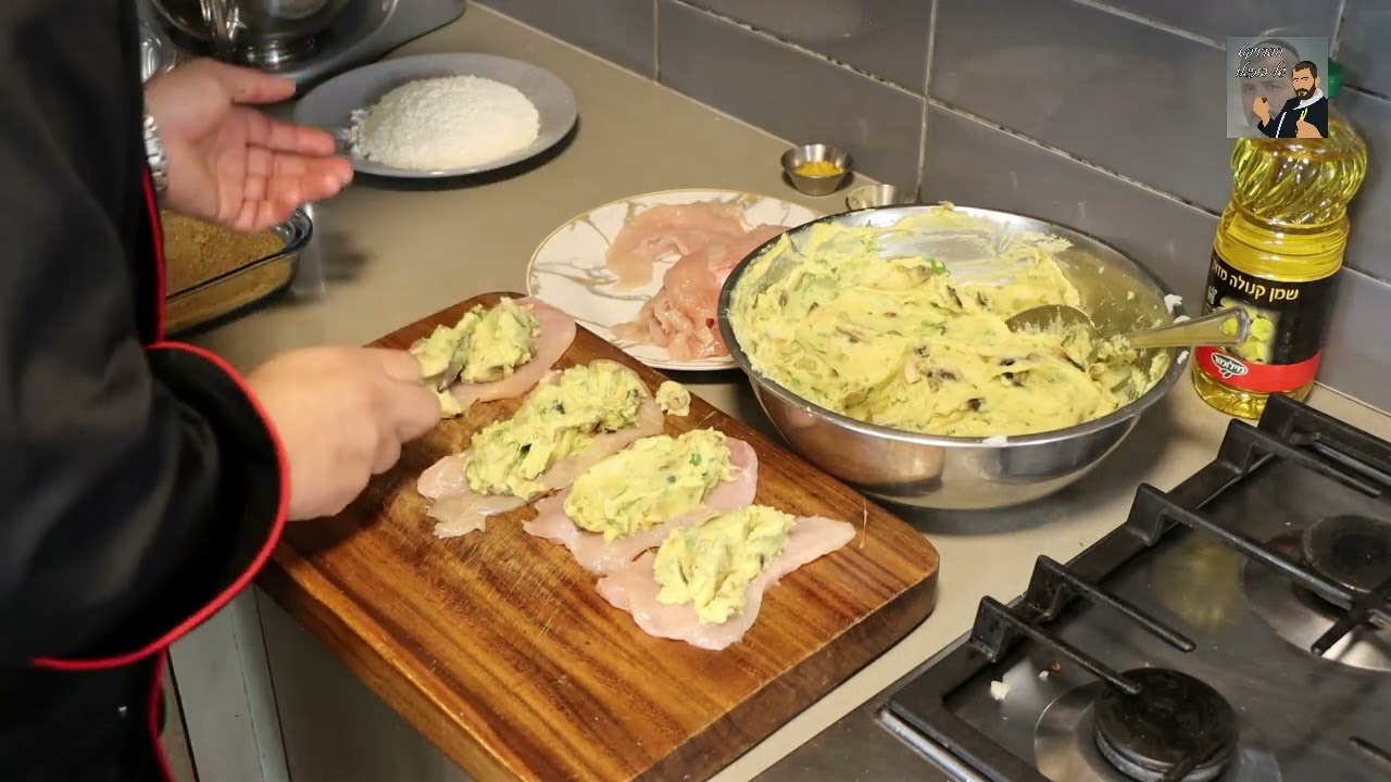 מצרכים למתכון שניצל ממולא בפירה 1 קילו תפו''א מבושל 1 בצל קצוץ דק מטוגן 1 סלסלת פטריות חתוכות לקוביות ומוקפץ 1 וחצי קילו שניצל עוף פרוס דק 1 כפית כורכום 1 כף מלח 1 כפית פלפל שחור 4 ביצים 1 כוס קמח לבן 300 גרם פרורי לחם 3 כפות שומשום 1 ליטר שמן לטיגון צרור פטרוזליה קצוצה אופן ההכנה יש לרסק את התפו''א ולהוסיף את הבצל והפטריות המוקפצות והפטרוזיליה להוסיף ביצה בפירה מלח פלפל כורכום ופלפל שחור למלא את השניצל במליט הפירה כמו שמוצג בסרטון בשתי שכבות לתבל את הביצים עם החרדל מלח ופלפל לקמח ולטבול בביצים המטובלים ולצפות בפרורי לחם והשומשום ולטגן בשמן בטמפרטורה 175 מעלות ובתאבון מימון בוזגלו בהצלחה הפרויקט של בוזגלו .....
