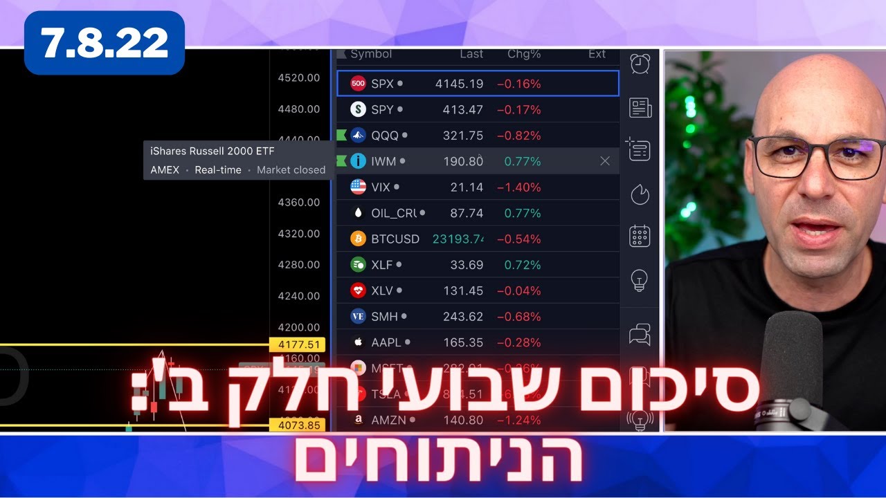 חינם בערוץ: האקדמיה של מיכה סטוקס - קורס בשוק ההון - כל מה שצריך לדעת כדי להתחיל: https://youtube.com/playlist?list=PLrNmo94geFHYKEZnHR6nDkPTtLWNG61a8 לינק לפטריון לרישום לקהילה: https://patreon.com/michastocks מה זה דיסקורד מה זה פטריון ואיך נרשמים - וידאו הסבר https://youtu.be/YWXzJRs801c --------- 00:00 פתיחה 01:42 SPX 03:40 QQQ 05:08 IWM 06:10 VIX 08:19 OIL_CRUDE 09:47 BTCUSD 10:52 XLF 12:58 XLV 15:06 SMH 16:57 SOXS 18:40 AAPL 20:05 MSFT 21:10 TSLA 22:20 AMZN 23:20 GOOGL 24:23 KWEB 25:25 UBER 26:15 TA-35 26:56 TA-125 --------- כל מה שתראו בסרטון הזה זו דעתי בלבד והיא אינה המלצה לפעולה, אני לא יועץ פיננסי אלא רק דמות ביוטיוב כל האמור בסרטון / בערוץ הינו למטרות מידע ובידור בלבד. איו לראות בסרטון זה ובמידע ו/או הניתוח הכלולים בה הצעה או ייעוץ לרכישה ו/או מכירה ו/או החזקה של ניירות ערך ו/או נכסים פיננסיים כלשהם או המלצה להשקעה באפיקים ספציפיים כלשהם. הניתוח בסקירה זו נעשה בהתבסס על מידע אשר פורסם ו/או היה נגיש לכלל הציבור ומידע אחר. האמור לעיל אינו מתיימר להכיל את כל המידע הדרוש למשקיע זה או אחר. הדעות והתחזיות האמורות לעיל, עשויות להשתנות ללא כל מתן הודעה נוספת. המידע בסרטון ובסקירה נכון לשעתו ואינו יעוץ או המלצה לפעולה כלשהי. לפיכך , האמור לעיל אינו מהווה בשום צורה שהיא תחליף לייעוץ השקעות המתחשב בנתונים ובצרכים המיוחדים של כל אדם. עורך סקירה זו לא יהיו אחראי בכל צורה שהיא לנזק ו/או הפסד שיגרם מהסתמכות על האמור לעיל, אם יגרמו. כל הזכויות בסקירה זו שייכות למיכה סטוקס והעברת חלקים מתוך הסקירה לאחרים, בהם או פרסומים בכל דרך שהיא, ללא קבלת אישור מראש ובכתב ממיכה סטוקס וללא ציון הערה זו בגוף הטקסט, במקום הבולט לעין, הנה אסורה, אם לא צויין אחרת.