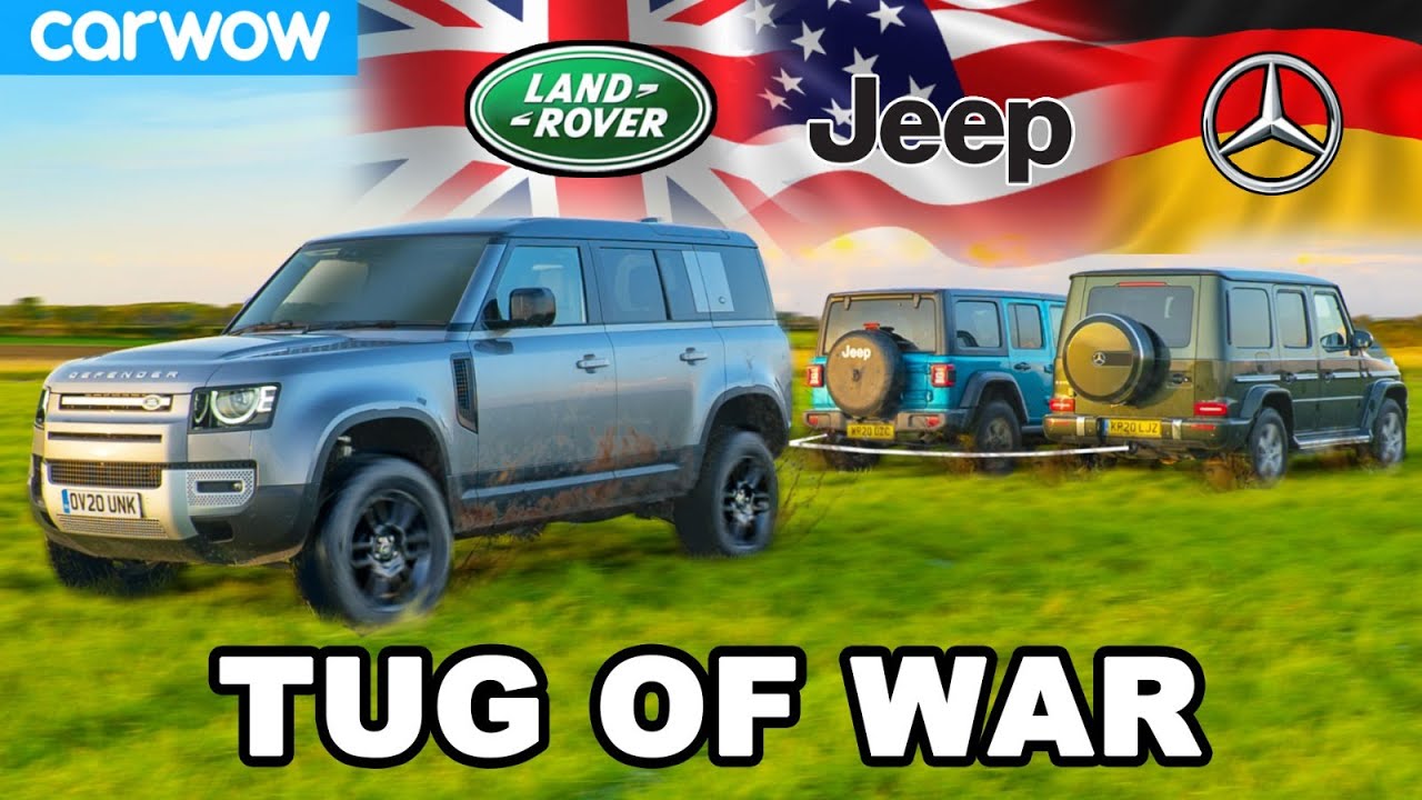 Need help buying your next car? Click https://www.carwow.co.uk/-help-me-carwow and my team and I will help you choose your ideal car at a fair price - from Mat Watson! ............................................................. It’s time for an almighty tug of war! First up we’ve got the best of British, the new Land Rover Defender, going up against the Jeep Wrangler Rubicon! On the face of it, you may think the Jeep Wrangler has the advantage, given its 2-litre turbo petrol can put down 270hp - more than the Defender’s 2-litre turbo, which can only produce 240hp. However, that’s just about where the Wrangler’s advantages seem to end, as the Defender can produce 430Nm (compared to the Wrangler’s 400Nm), it’s heavier (weighing 2.4 tonnes compared to the Wrangler’s 2 tonnes) and it’s jam-packed full of off-roading tech! However, that’s not all! Once these two have gone head-to-head, the Mercedes G350d will roll up to take on the winner! With a 2.9-litre straight-six diesel which can produce 286hp & 600Nm, this is one Mercedes which can easily take on either of these competitors! All we know is - you don’t want to miss this! ............................................................. Instagram – http://www.instagram.com/carwow Tiktok - https://www.tiktok.com/@carwow Facebook – http://www.facebook.com/carwowuk Twitter – http://www.twitter.com/carwowuk Sign Up to our Newsletter – http://bit.ly/carwow-Newsletter Awkward haggling is a thing of the past with carwow. Choose your perfect car with our configurator tool and let the country’s best dealers compete over you. Compare the five best offers by price, location and dealer ratings and choose the one that’s right for you – no hassle, no haggling, just a great deal. Oder auch in Deutschland Geld beim Autokauf sparen – http://bit.ly/carwow-DE Visita nuestra página web para saber cuánto te puedes ahorrar en tu nuevo coche – http://bit.ly/carwow-ES