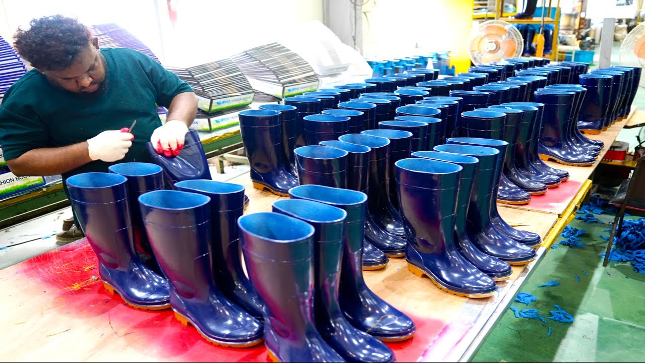 고무장화를 대량으로 만드는 과정. 한국의 고무장화 공장.
