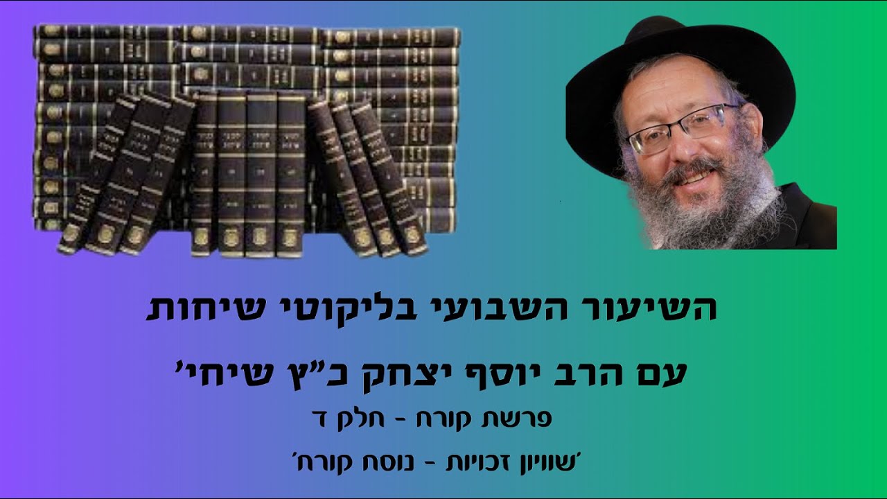 השיעור השבועי בליקוטי שיחות פרשת קורח חלק ד. השיעור במסגרת לימודי כולל ערב קהילת חב"ד רחובות המתקיים מידי יום רביעי. עם הגאון החסיד הרב יוסף יצחק כ"ץ שליט"א מראשי ישיבת חב"ד באר שבע