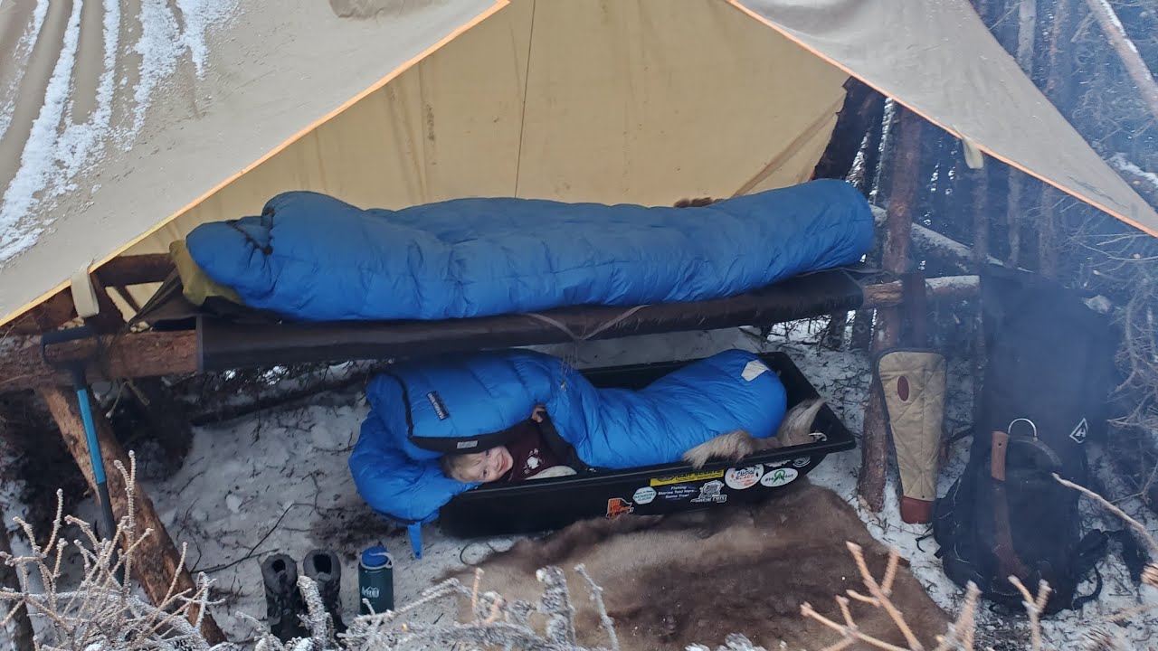 Bushcraft Cot & Survival Shelter Camping with 4 yr old in a Snow Storm