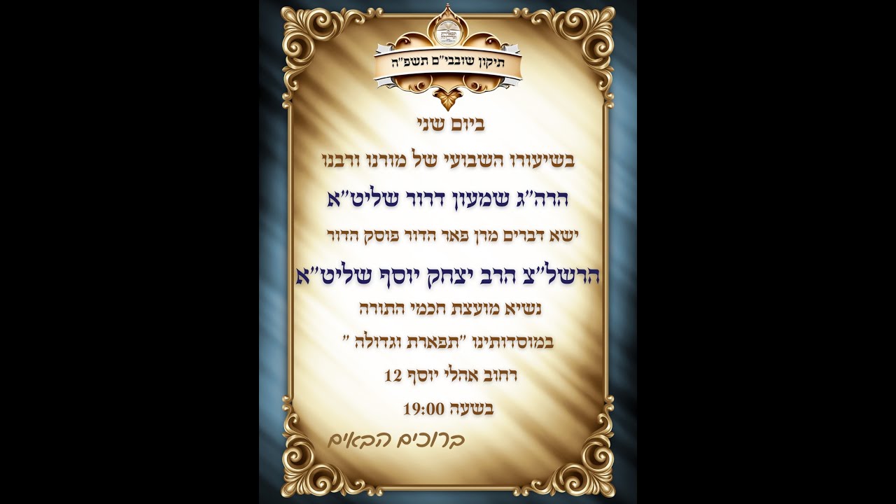 שיעורו השבועי של הרה"ג שמעון דרור שליט"א במעמד הראשל"צ הרב יצחק יוסף שליט"א לפרשת בא ,ימי השובבי"ם השיעור מועבר בשידור ישיר ממוסדות "תפארת וגדולה" , רחוב אוהלי יוסף 12 ירושלים בשעה 19:00 בערב