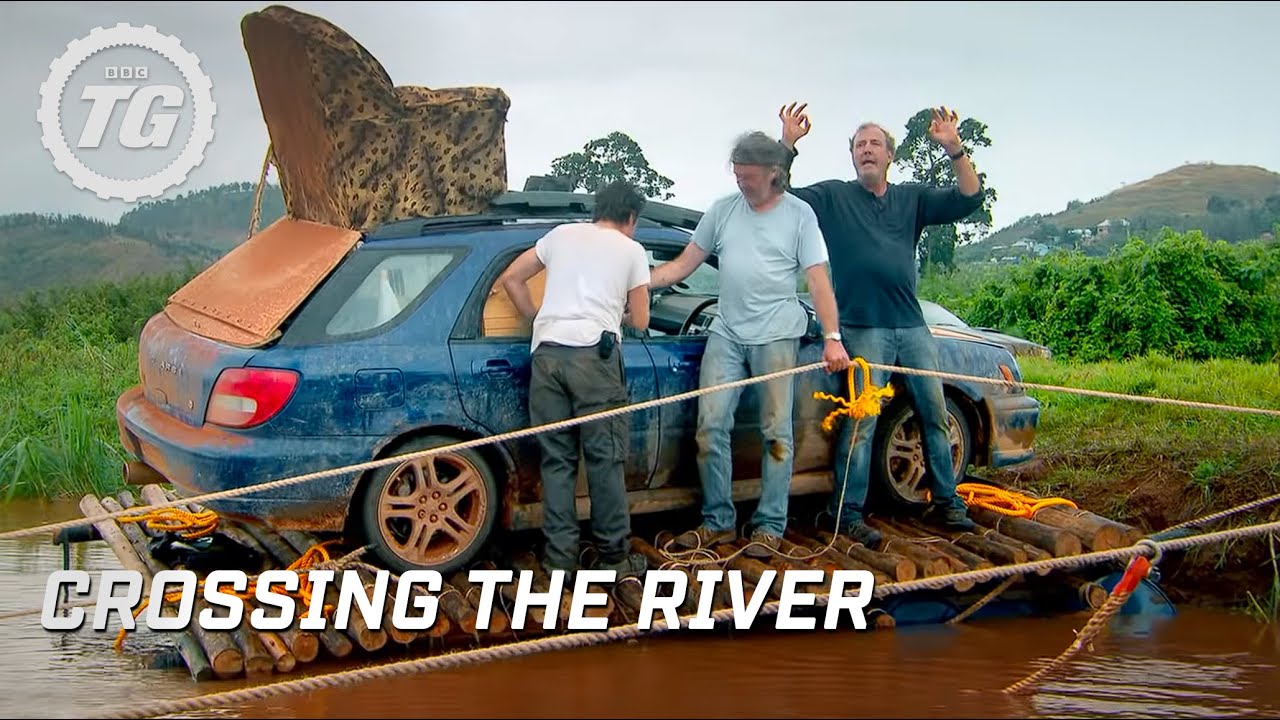As the boys travel eastwards, our motoring trio are stopped by a river and realise it is too deep to wade through with their cars, especially since there are crocodiles lurking within it. Jeremy comes up with the idea of making their own car-ferry, designed specifically to take their cars across the river, (similar to one they had seen in Albania) using wood and rope.