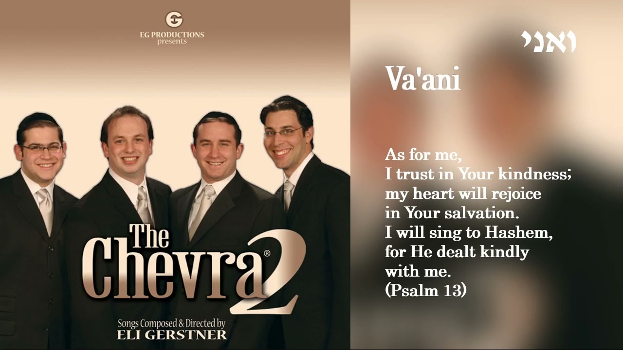 Here's links to buy the Album (Available as a download or CD): https://egproductions.net/chevra-2-album Itunes: https://music.apple.com/us/album/the-chevra-2/1606100642 "Va'ani" The Chevra Composed & Produced by: Eli Gerstner Arranged by: Eli Yonah & Eli Gerstner Vocals Recorded @ EG Studios by: Eli Gerstner Mixed @ Creative Studios by: Eli Yonah Mastered @ Gater Music by: Larry Gates A”H ►Follow The Chevra online: Instagram: @chevragroup Facebook: /thechevragroup Twitter: /chevragroup Website: TheChevra.com For More Information About The Chevra: Please Call EG Productions @ 718-853-9403 or email us info@EGProductions.net © Copyright Eli Gerstner 2003-2022. All Rights Reserved.
