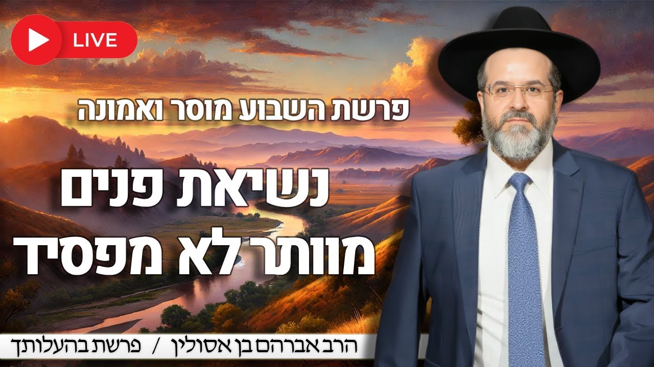 מה המשמעות של "נשיאת פנים"? איך הוויתור יכול דווקא להוביל לרווח גדול – רוחני ואישי? בשיעור מלא תוכן ועומק, הרב אברהם בן אסולין משלב בין פרשת השבוע, מוסר ויראת שמיים, כדי להעניק לנו כלים לחיים מתוך אמונה חזקה והתבוננות פנימית. השיעור מתקיים מדי יום ראשון בשעה 20:30 בבית הכנסת הרב כפוסי, רחוב שמריהו לוין 5, חולון. להרצאות ושיעורים: 052-7669262