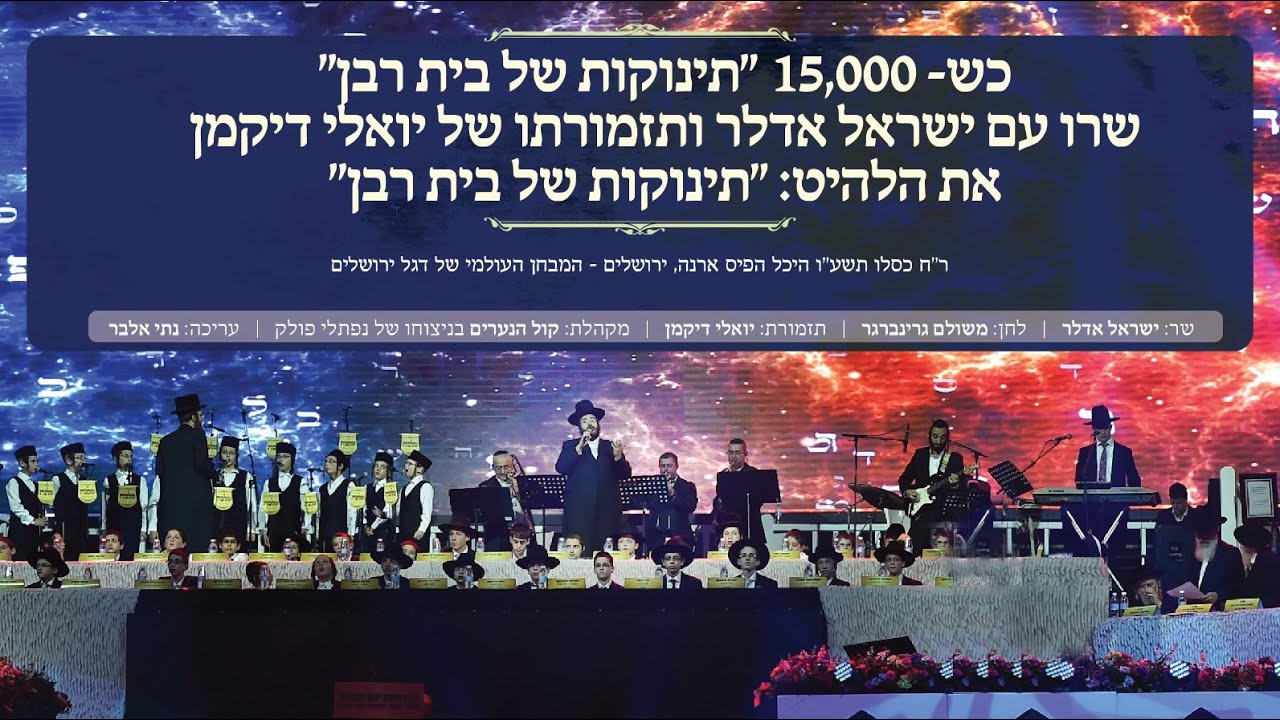 Song Composed by Meshulam Greenberger, First Recorded by Yisroel Adler on his Debut Album "Oirois" https://mostlymusic.com/products/yisroel-adler-oirois-pre-order באירוע יוקרתי שנערך ע"י דגל ירושלים לכ-15,000 ילדי ישראל בהיכל פיס ארנה ירושלים, הופיע ישראל אדלר מלווה בתזמורתו של המאסטרו יואלי דיקמן עם מקהלת "קול הנערים" בניצוחו של נפתלי פולק, כשהם מבצעים את הלהיט הענק: "תינוקות של בית רבן" שהפך באחת לשיר ההמנון של ילדי ישראל – תינוקות של בית רבן. "תינוקות של בית רבן" הופק והושר לראשונה באלבום הבכורה של ישראל אדלר: "אורות" שמציין בימים אלו את יום השנה ליציאתו. lyrics: לעתיד לבוא כשיבוא מלך המשיח יתקבצו עימו כל עוסקי התורה ורק על ידי זכות תינוקות של בית רבן יתגבר כוח המשיח וישרה שכינה בישראל Yisroel Adler, began his musical Career as a Badchan by weddings, he now has been doing this for many years with great success in Israel and across the globe. Yisroel is a son of world renowned Chazzan Chaim Adler, he has a great love and feeling toward chazanas and is also a Ba'al Tefilah for Yom Tov and on Shabbos. Three years ago, Yisroel began working on his album. He met with the greatest composers and took his time not compromising but looking for the best! The tittle song 'Oiros' was released in middle of the winter as a single song became a wedding hit more known as 'Chassidim V'anshei Mase'. The album combines several genres of chasidic music, songs of joy along with emotion and of course songs in Yiddish Graman. The album features songs composed by Pinky Weber, Meshulem Greenberger, Meir Adler, and others, Music Arranged by Moshe Laufer, Ofir Sobol, Yuval Stoppel, Yehudah Glili, & Meir Adler.