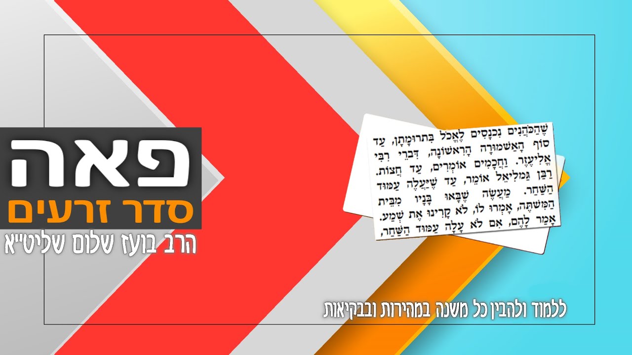 המשנה היא קובץ של פרשנויות על המקרא שתרם רבות לעיצוב היהדות וארגון החיים היהודיים לאחר חורבן הבית השני. המשנה חוברה במשך כמה דורות משלהי ימי הבית השני ובעיקר ב-150 השנים שעברו מאז חורבנו בשנת 70 לספירה. המשנה מחולקת לשישה 'סדרים', המכילים כל אחד מספר 'מסכתות'. כל מסכת עוסקת בנושא ספציפי אחד המרומז בשמה של אותה המסכת. סדרי המשנה נועדו להוות קו מנחה ובסיס איתן לשם קביעת ההלכות בקהל ישראל, לדורות. סדר זרעים – עוסק בברכות ובמצוות התלויות בארץ. מכיל 655 משניות ב-11 מסכתות. סדר מועד – עוסק בשבתות, חגים ותעניות. מכיל 681 משניות ב-12 מסכתות. סדר נשים – עוסק באישות, קידושין, גירושין וכדומה. מכיל 578 משניות ב-7 מסכתות. סדר נזיקין – עוסק בדיני ממונות וסדרי המשפט. מכיל 685 משניות ב-10 מסכתות. סדר קדשים – עוסק בבית המקדש ובקורבנות. מכיל 590 משניות ב-11 מסכתות. סדר טהרות – עוסק בסוגי טומאות וטהרתן. מכיל 1,003 משניות ב-12 מסכתות. שישה סדרי משנה סדר זרעים: ברכות, פאה, דמאי, כלאיים, שביעית, תרומות, מעשרות, מעשר שני, חלה, עורלה, ביכורים. סדר מועד: שבת, עירובין, פסחים, שקלים, יומא, סוכה, ביצה, ראש השנה, תענית, מגילה, מועד קטן, חגיגה. סדר נשים: יבמות, כתובות, נדרים, נזיר, סוטה, גיטין, קידושין. סדר נזיקין: בבא קמא, בבא מציעא, בבא בתרא, סנהדרין, מכות, שבועות, עדויות, עבודה זרה, אבות, הוריות. סדר קודשים: זבחים, מנחות, חולין, בכורות, ערכין, תמורה, כרתות, מעילה, תמיד, מידות, קינים. סדר טהרה: כלים, אוהלות, נגעים, פרה, טהרות, מקוות, נידה, מכשירין, זבים, טבול יום, ידיים, עוקצים. הרב בועז שלום שליט"א הוציא בשנים האחרונות אלפי שיעורי תורה במגוון נושאים. שיעורים מעמיקים בתנ"ך, משנה, דף היומי, מחשבה, מוסר, הלכה, אגדה, עין יעקב, אור החיים, חומש עם רש"י, כלי יקר, דרשות על פרשת שבוע, ועוד. הרב מכהן כיו"ר ארגון 'טעמו וראו', וראש מדרשת 'בית אליהו' ברחוב דב גרונר 11 בבני ברק. במשך שנים עסק הרב במסירת הרצאות ובקירוב רחוקים בארגון 'ערכים' ובערוץ 'הידברות' במגוון נושאים. כמו כן מוסר הרב שיעורים קבועים במדרשת 'פסגות' שברחוב בן ציון גליס 37 אזוה"ת סגולה בפ"ת. הרב בועז שלום חיבר שני ספרים 'משנת החלומות' ו'משנת הגלגולים'. לרב בועז שלום אתר אינטרנט בשם "טעמו וראו" שם תוכלו למצוא את כל שיעוריו בכתובת https://taamu.co.il השיעורים ניתנים לשמיעה ואף להורדה בחינם. באתר ניתן אף להעיר או לשאול על השיעורים ולקבל את תגובת הרב. זכות השיעור לעילוי נשמת אברהם בן ימנה ויעקב ויוסף בן אורה וחיים.