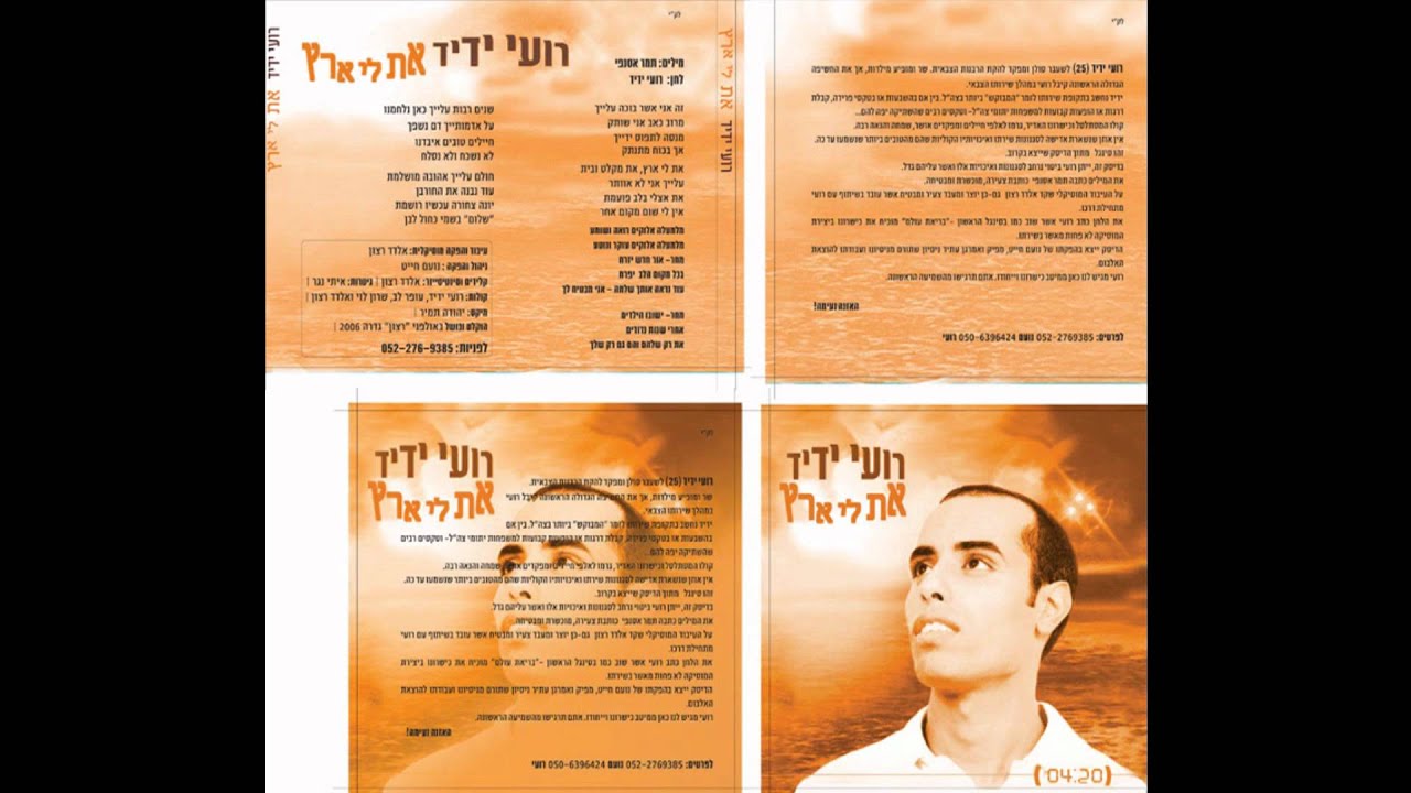 ה ל ה י ט הכי מפורסם של 'רועי ידיד' העונה לשם 'את לי ארץ' מתוך אלבומו הראשון. את הלחן חיבר רועי בעצמו, המילים של תמר שרביט-אסנפי והעיבוד של אלדד רצון והכל בהפקתו של נועם חייט (ענבי הגפן). השיר מדבר על ההתנתקות הכואבת מגוש קטיף אך בנימה של אופטימיות בפזמון בידיעה שהכל מכוון מלמעלה והיום אתה נעקר ומחר אתה נוטע.. אין לו גרסה רשמית ביוטיוב ולכן הועלה שוב. השיר יצא בסוף שנת 2005, מיד לאחר הטראומה הנוראית. ויצא בשנת 2006 כשיר מספר 4 מתוך אלבום הביכורים של רועי ידיד, וכשיר הנושא של האלבום. לפרטים נוספים ולסגירת אירועים והופעות: ☎ 0524060080 רועי ידיד 📧 royyadid@gmail.com בקרו גם בדף הפייסבוק של רועי: http://bit.ly/royFBpage רועי ידיד באינסטגרם: https://bit.ly/royINpage