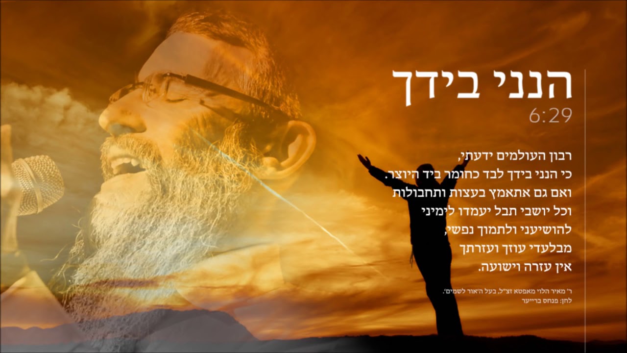 אברהם פריד בסולטן 2024. אורח מיוחד: עידן רייכל כרטיסים: https://tic.li/yQNLo0g אינסטגרם - https://www.instagram.com/avrahamfried_official פייסבוק - https://www.facebook.com/AvrahamFried.Official להצטרפות לקהילת "החברים של אברהם פריד" בוואטסאפ - https://tic.li/gkYG05O Hineni Byadcha, also known as Riboin Haolamim, or even Yadati has become a prayer of our people Sung by Avraham Fried הנני בידך ------------ רִבּוֹן הָעוֹלָמִים יָדַעְתִּי כִּי הִנְנִי בְּיָדְךָ לְבַד כַּחֹמֶר בְּיַד הַיּוֹצֵר. וְאִם גַּם אֶתְאַמֵּץ בְּעֵצוֹת וְתַחְבּוּלוֹת וְכָל יוֹשְׁבֵי תֵבֵל יַעַמְדוּ לִימִינִי לְהוֹשִׁיעֵנִי וְלִתְמֹךְ נַפְשִׁי, מִבַּלְעֲדֵי עֻזְּךָ וְעֶזְרָתְךָ אֵין עֶזְרָה וִישׁוּעָה. --------------------------------------------- מילים: ר' מאיר הלוי מאפטא זצ"ל לחן: ר' פנחס ברייער עיבוד: נפתלי שניצלער